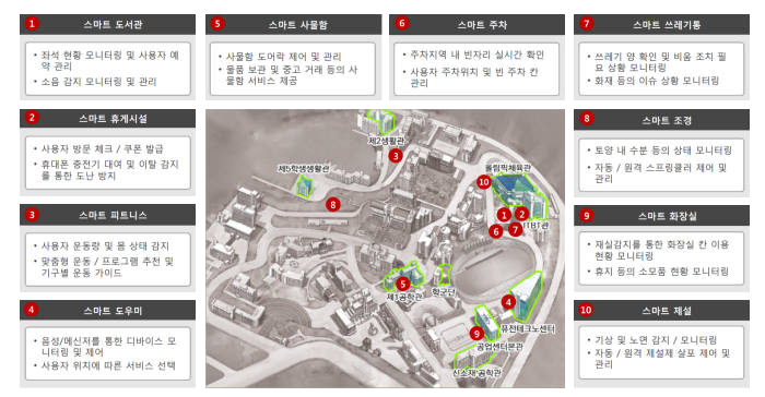 스마트 도서관은 좌석현황을 모니터링하고 예약관리하며 도서관내 소음을 감지, 관리자에게 알려준다. 스마트휴게실은 휴게시설 내 방문자와 쿠폰을 체크하고 대여한 휴대폰 충전기 등 이탈을 감지해 도난 방지 서비스를 제공한다.